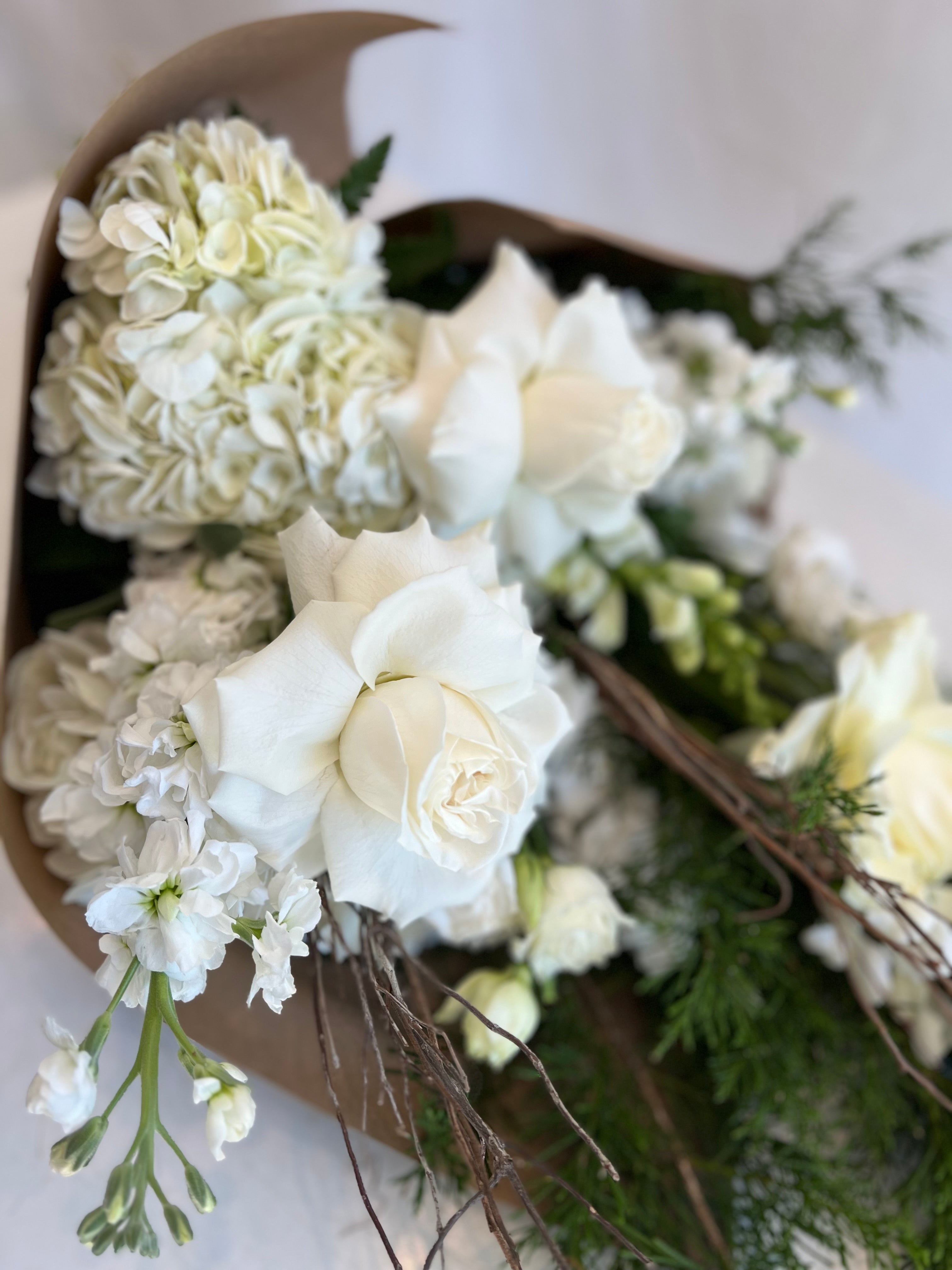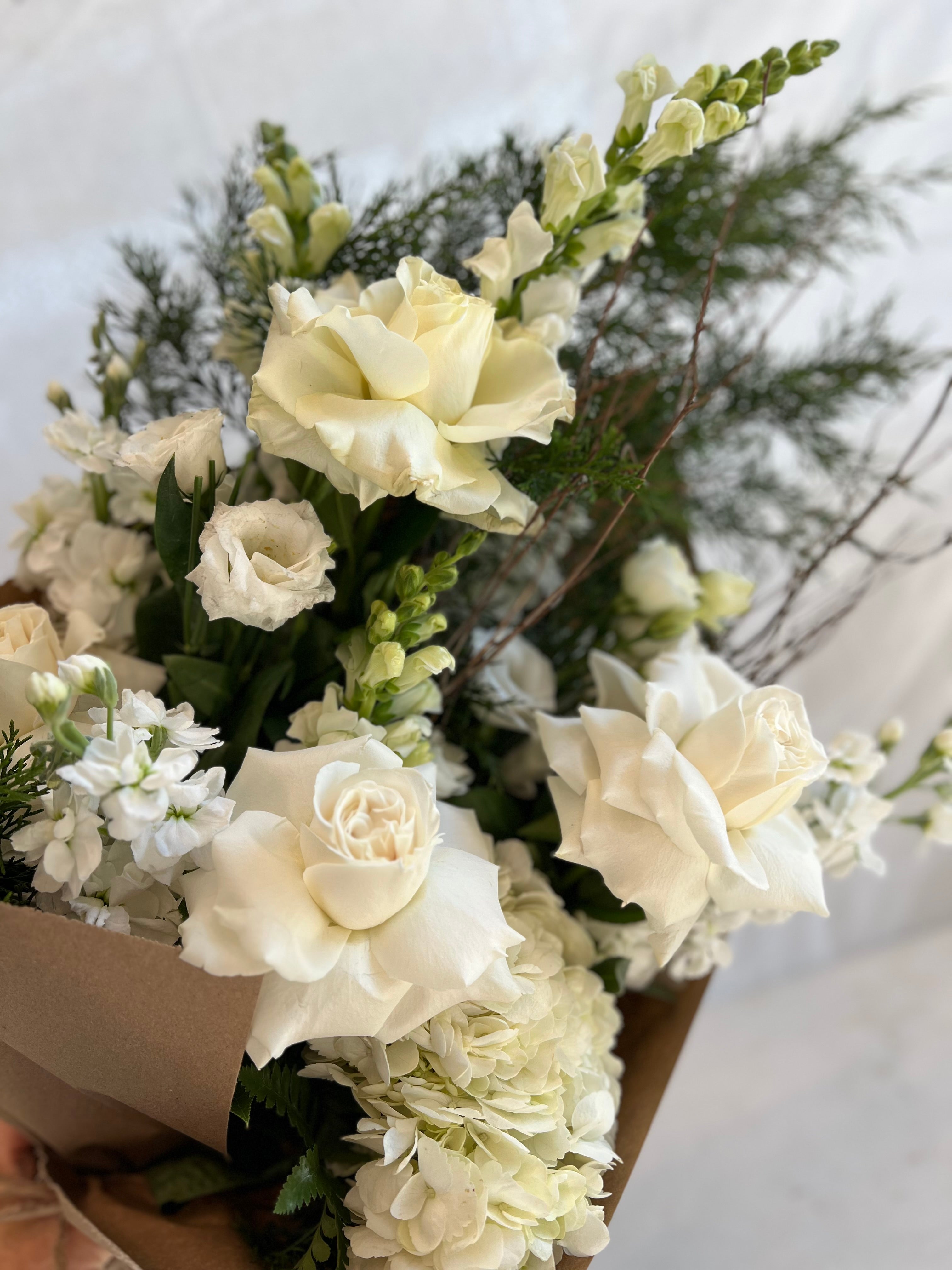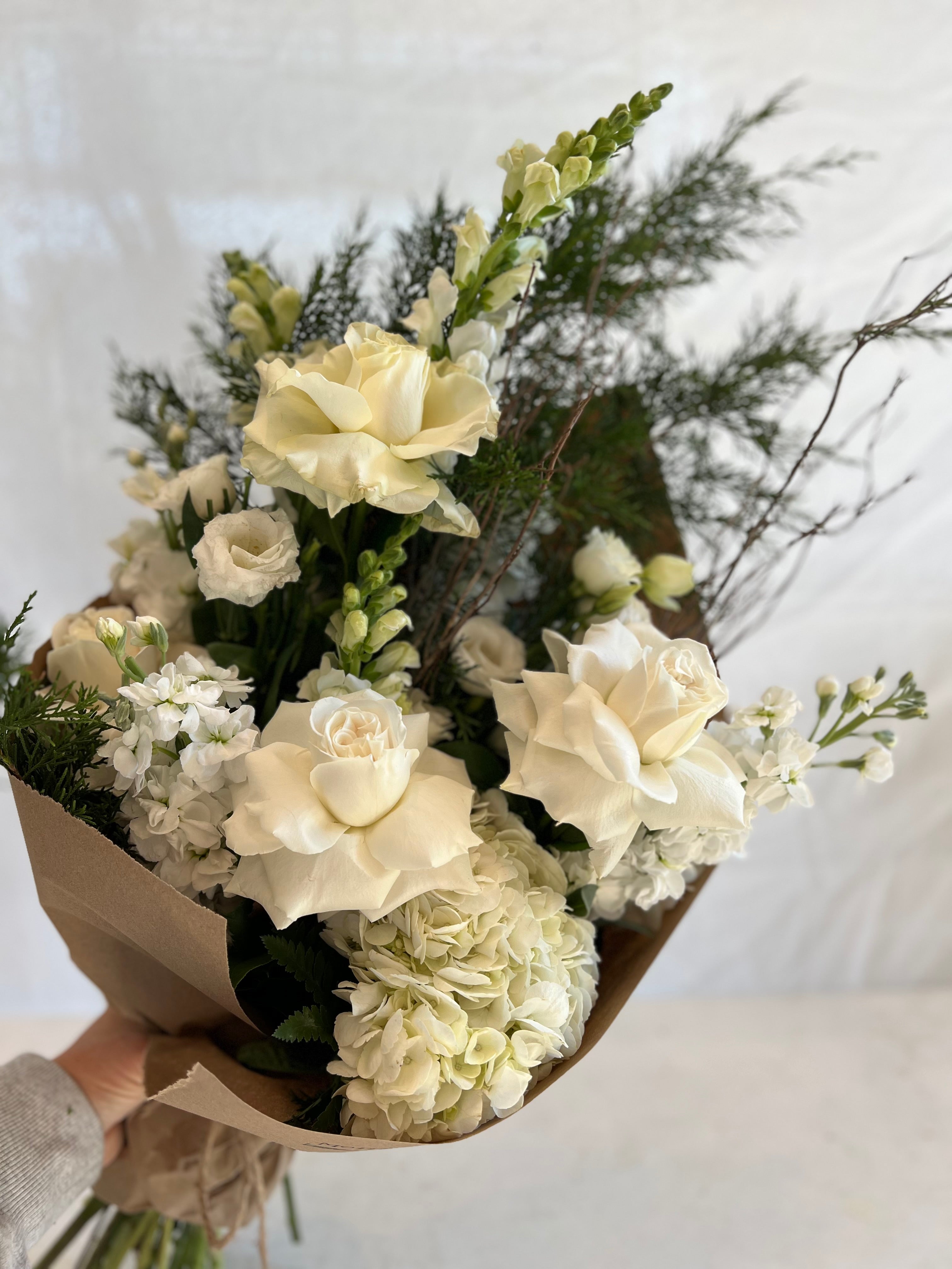 Let the bliss of winter refresh your home with our twist on a Winter Wonderland Wrapped Bouquet. Transport yourself to a snowy mountain oasis without ever leaving your coastal haven! This wrap is the perfect choice for someone who already owns a vase. Have it delivered or pick up at the shop.